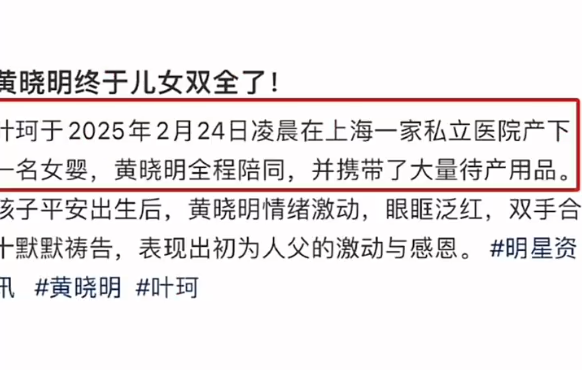 2月26日,黄晓明与叶珂的喜讯再次刷爆社交媒体,话题迅速登上热搜,网友们纷纷热议“叶珂顺利产女”的消息。这对情侣的幸福时刻再次成为公众关注的焦点。据悉,黄晓明的女友叶珂于2月24日凌晨在上海一家私立